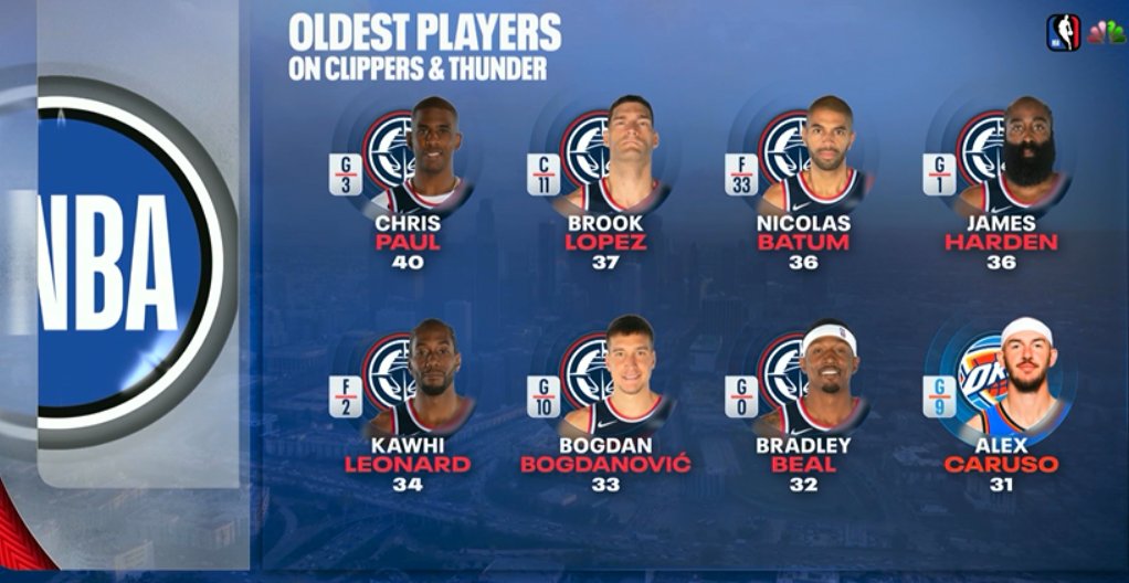 Đài truyền hình phát sóng trận đấu này đã so sánh độ tuổi của các cầu thủ Thunder và Clippers. Bảy cầu thủ lớn tuổi nhất của hai đội đều thuộc Clippers. Caruso là người lớn tuổi nhất trong Thunder nhưng anh mới 31 tuổi.