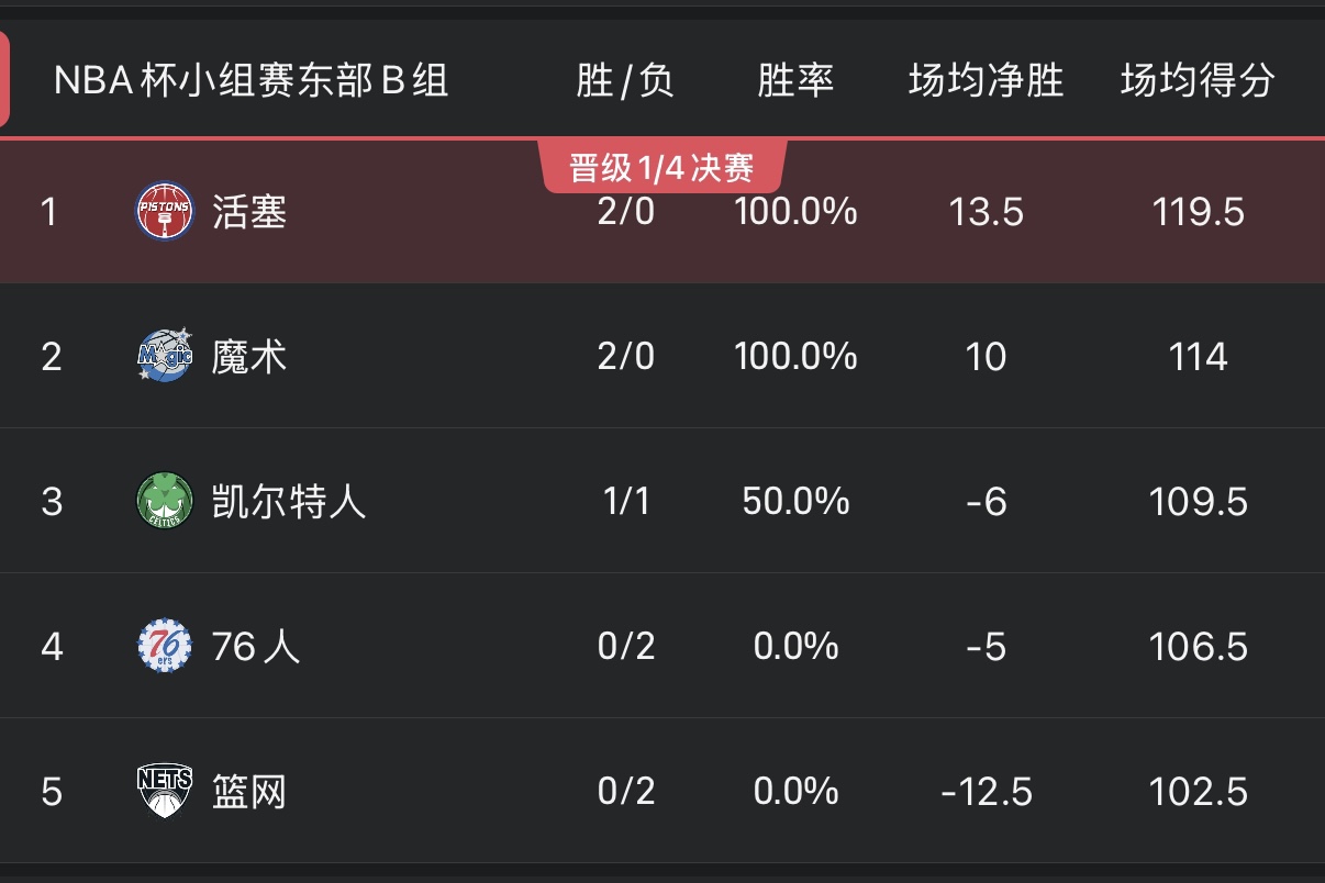 *Thể lệ vòng bảng NBA Cup như sau: đội nhất mỗi bảng sẽ trực tiếp vào vòng loại trực tiếp, trong khi hai đội nhì có thành tích tốt nhất sẽ giành quyền vào vòng loại trực tiếp.