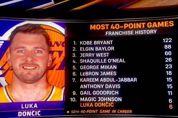 TV Hoa Kỳ đã đếm số lượng hơn 40 trận đấu trong lịch sử của Lakers: Doncic gỡ hòa Magic và xếp thứ mười, LeBron đứng thứ sáu với 18 lần, và Kobe dẫn đầu với 122 lần.