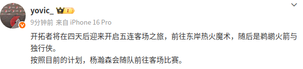 Văn bản gốc từ mạng xã hội: "Trail Blazers sẽ mở ra chuyến hành quân kéo dài 5 trận tới East Coast Heat and Magic, tiếp theo là Pelicans, Rockets và Mavericks. Theo kế hoạch hiện tại, Yang Hansen sẽ đồng hành cùng đội đến trận đấu trên sân khách."