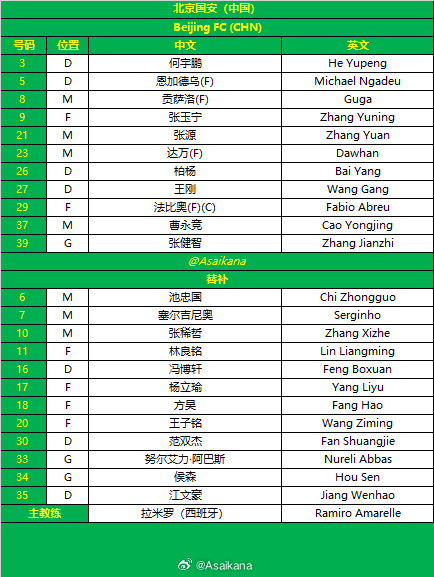 Đội hình xuất phát của Guoan Bắc Kinh:39-Zhang Jianzhi, 3-He Yupeng, 5-Ngadewu, 26-Bo Yang, 27-Wang Gang, 8-Gujia, 21-Zhang Yuan, 23-Dawan, 37-Cao Yongjing, 9-Zhang Yuning, 29-Fabio