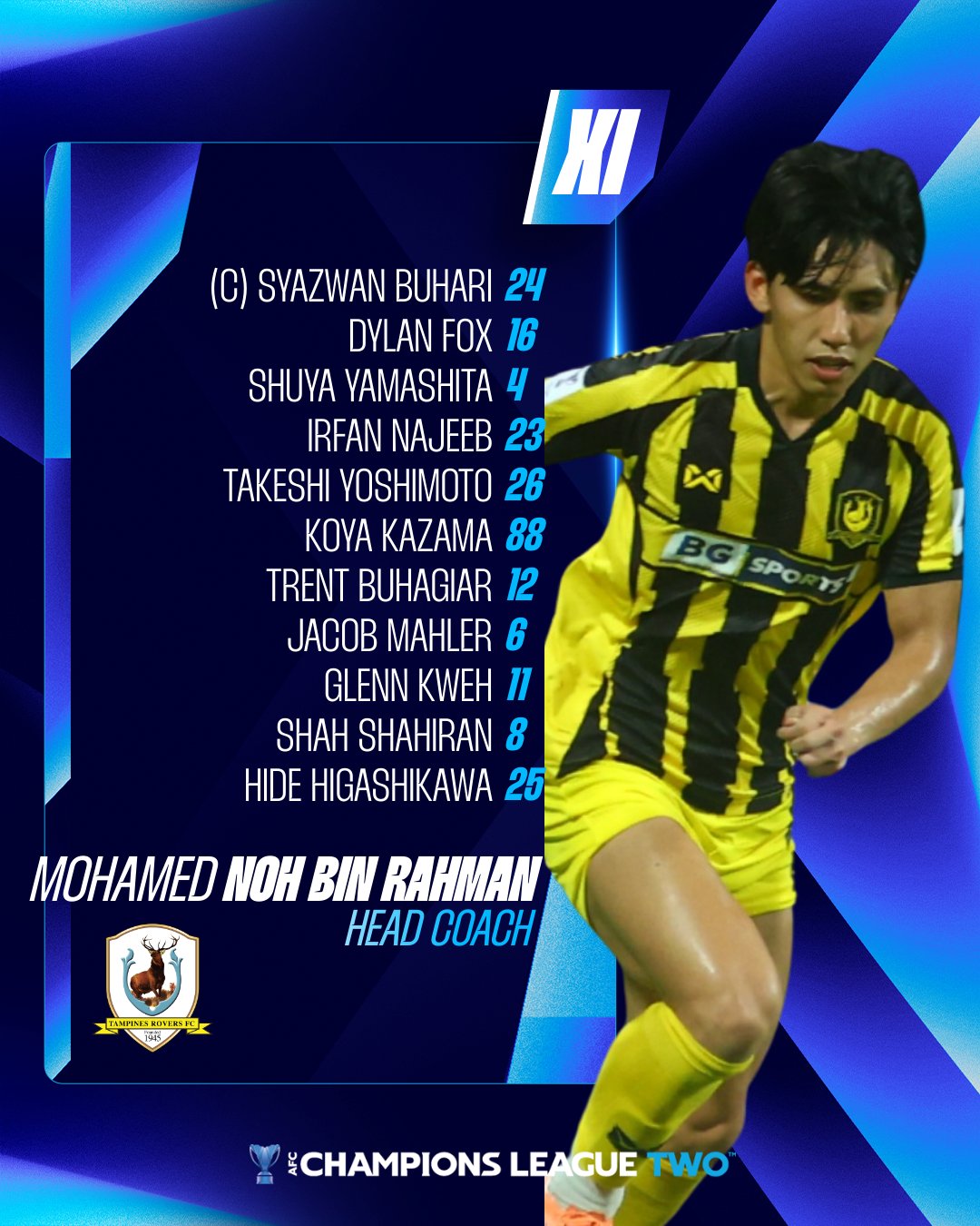 Tampines Wanderers bắt đầu đội hình:24-Buhari, 16-Fox, 23-Najib, 4-Yamashita Hiiragi, 26-Yoshimoto Takeshi, 88-Kazama Hiroya, 12-Buhajir, 8-Shahilan, 6-Mahler, 11-Guo Jiasu, 25-Higashikawa Tsutsumi