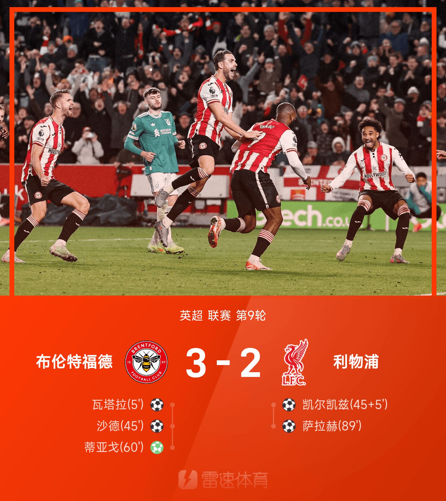 Phút 58 của hiệp 2, Van Dyke bị phạm lỗi 12m trái luật. Thiago thực hiện quả phạt đền và Brentford nâng tỷ số lên 3-1. Szoboszlai kiến tạo cho Salah ghi bàn trước khi trận đấu kết thúc nhưng điều đó không giúp ích gì cho kết quả. Chung cuộc, Liverpool thua 2-3 trước Brentford trên sân khách và chịu thất bại thứ 4 liên tiếp tại giải VĐQG.