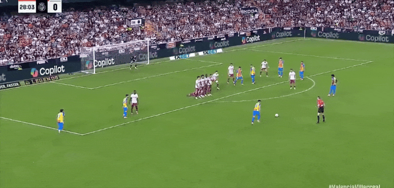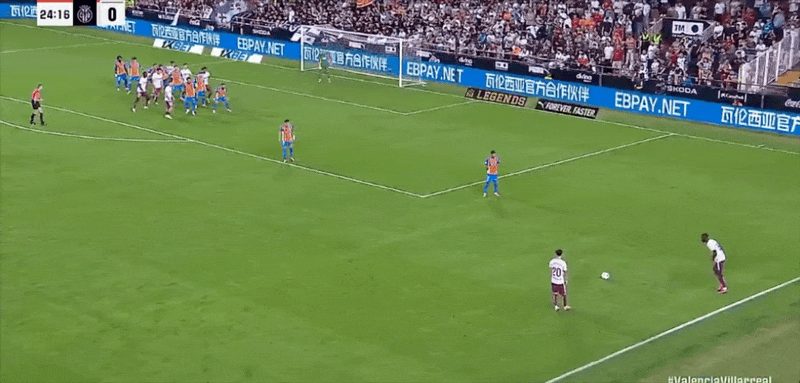 29’ Pepelu thực hiện quả đá phạt trực tiếp trước khu vực 3 giây, bóng bay về phía khán đài