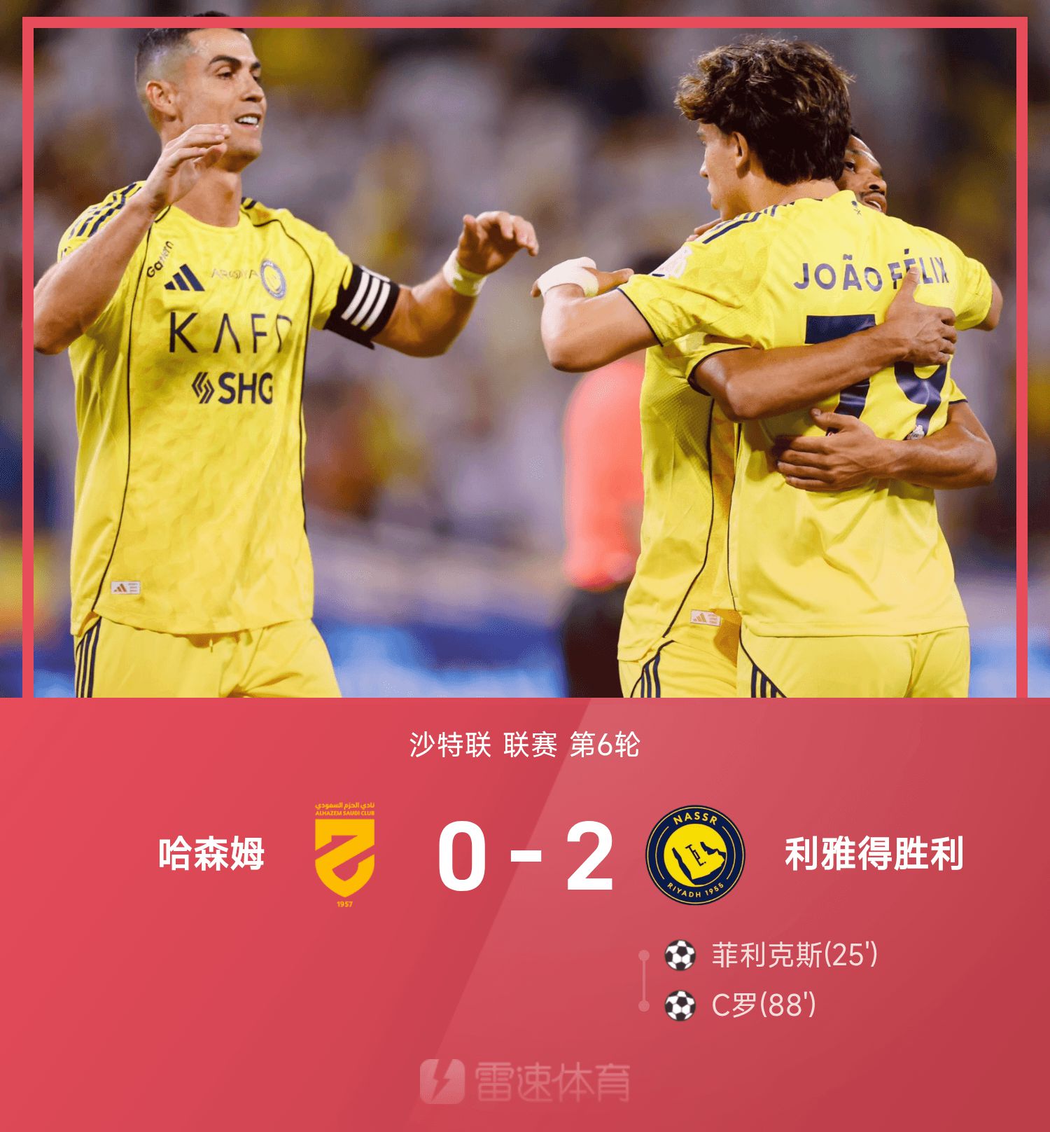 6686 Thể thao, ngày 26 tháng 10, Ở vòng 6 giải Saudi League 25/26, Riyadh đã đánh bại Hashem 2-0. Đầu hiệp một, Felix đánh đầu phá vỡ thế bế tắc. Trước khi hiệp hai kết thúc, cú lốp bóng của Ronaldo ấn định chiến thắng. Chung cuộc, Riyadh đã đánh bại đội khách với tỷ số 2-0 trước Hashem và thắng 6 trận liên tiếp.