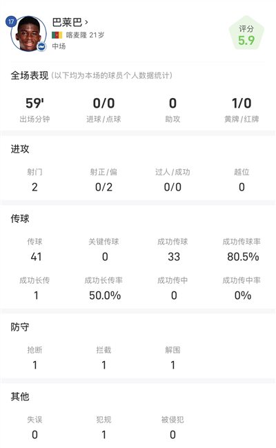Thống kê của Baleba trong trận đấu với Manchester United: