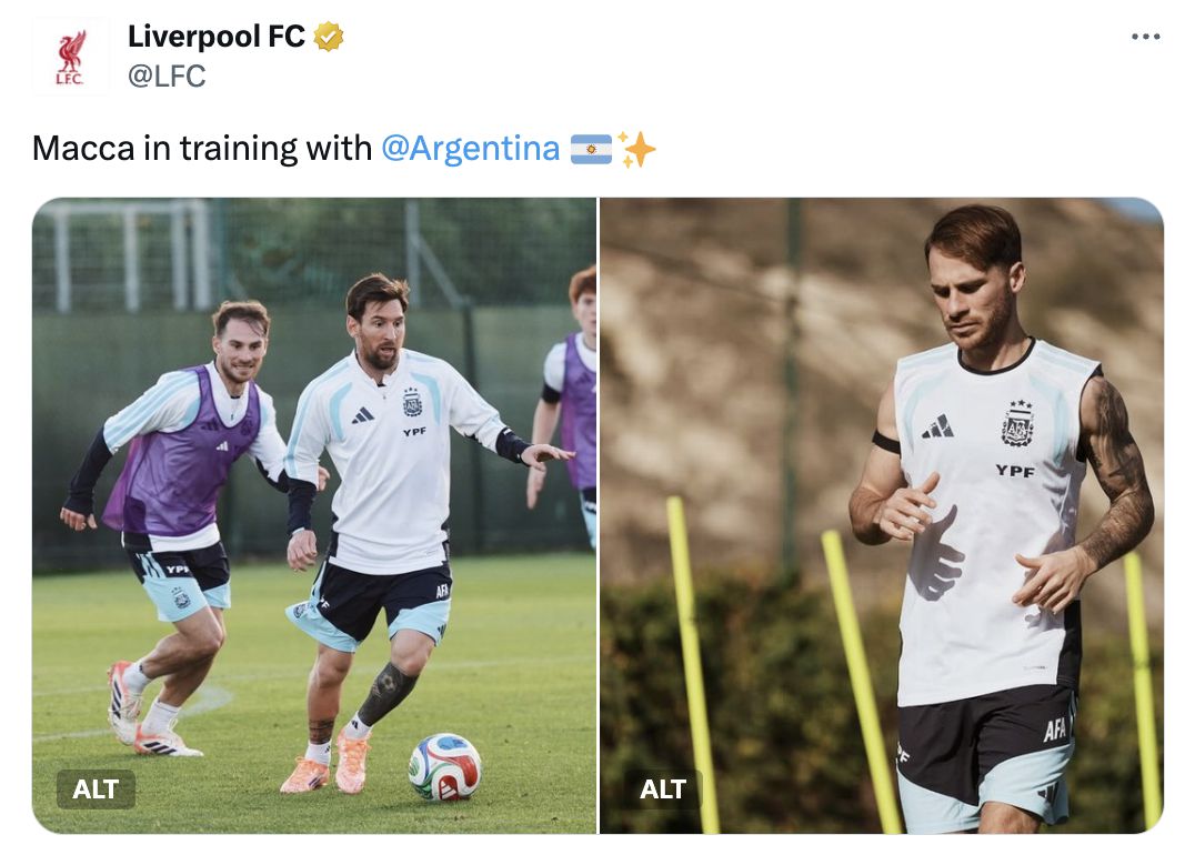 Tweet chính thức của Liverpool đăng ảnh Macca tập luyện đội tuyển quốc gia, Messi bị fan chế giễu vì có mặt trong ảnh