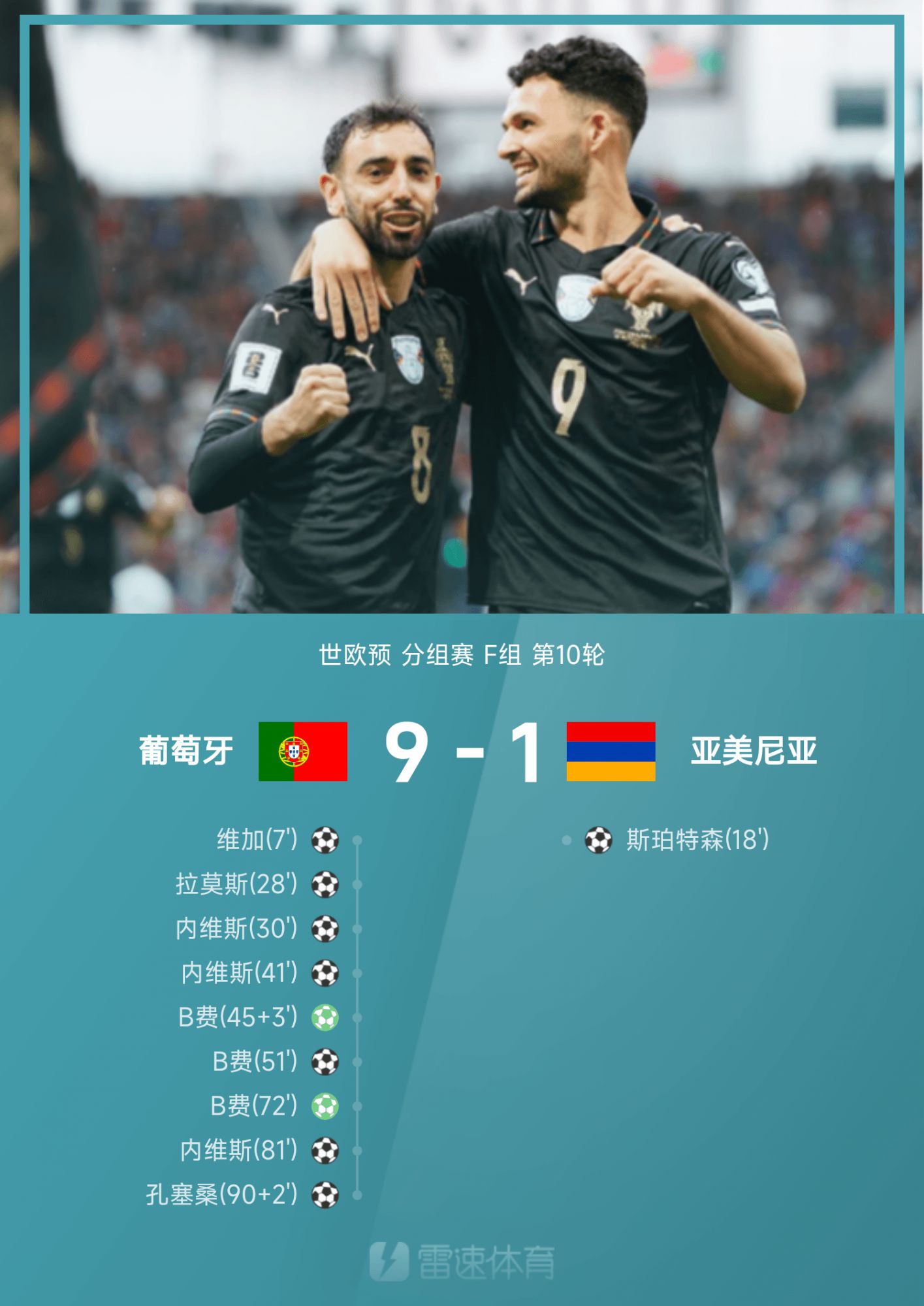 6686 Sports đưa tin ngày 16/11 rằng ở lượt trận thứ 10 bảng F Vòng loại khu vực châu Âu thế giới 2026, đội chủ nhà Bồ Đào Nha đã đánh bại Armenia với tỷ số 9-1. Vega ghi bàn cho Bồ Đào Nha, rồi Spertson gỡ hòa cho Armenia; Ở trận tiếp theo, đội Bồ Đào Nha giống như một vị thần giúp đỡ, Neves và B Fee lần lượt hoàn thành hat-trick, Ramos thực hiện đường chuyền và cú sút, còn Conceição thêm kem vào bánh cho đội. Bồ Đào Nha đứng nhất bảng F với 13 điểm với 4 trận thắng, 1 trận hòa và 1 trận thua, đồng thời giành quyền trực tiếp tham dự World Cup 2026 của Mỹ, Canada và Mexico.