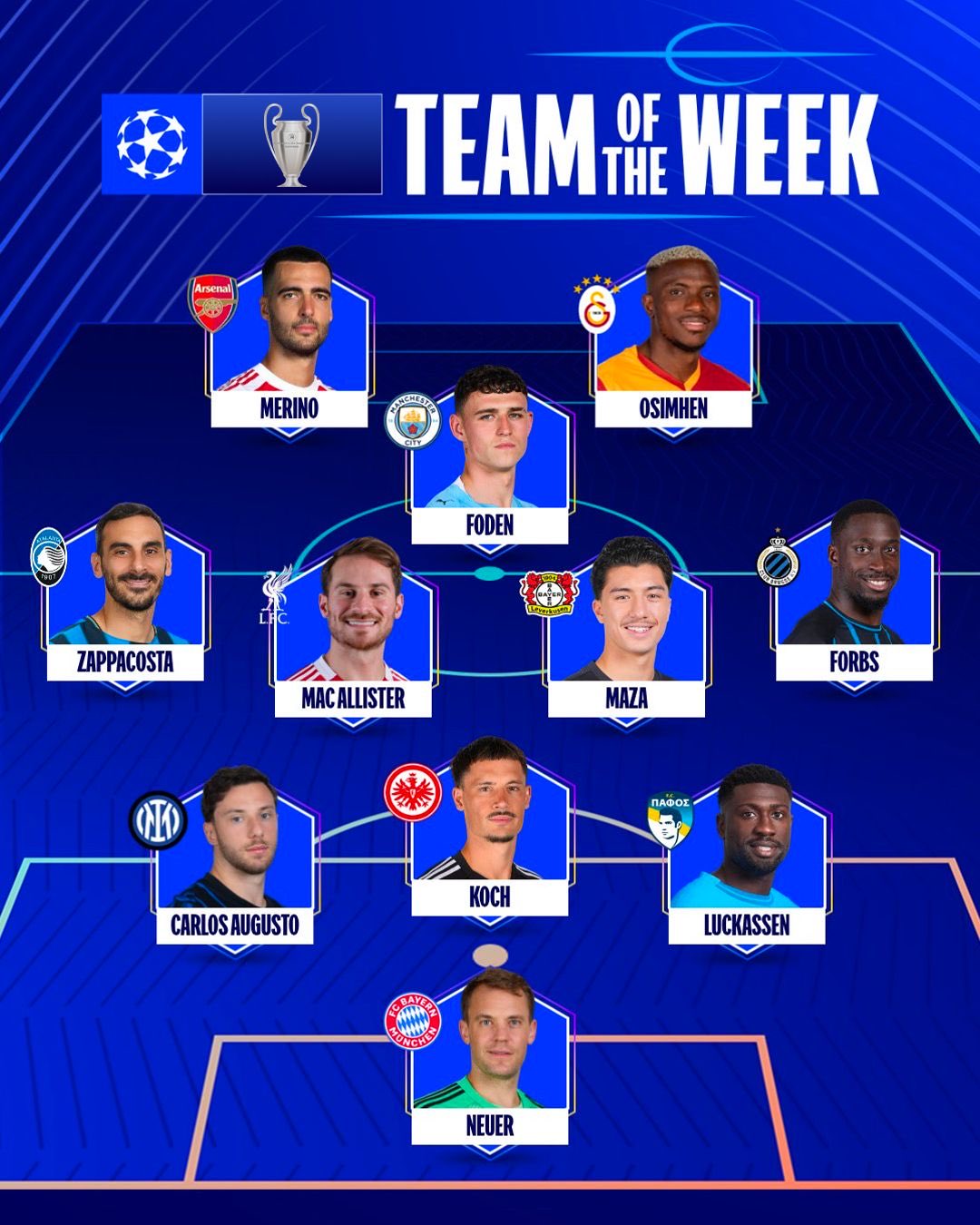 6686 Bản tin thể thao ngày 7 tháng 11 UEFA đã chính thức công bố đội hình của tuần cho vòng 4 của giải đấu. Osimhen và Neuer dẫn đầu danh sách, cùng với Foden, McAllister và Merino.