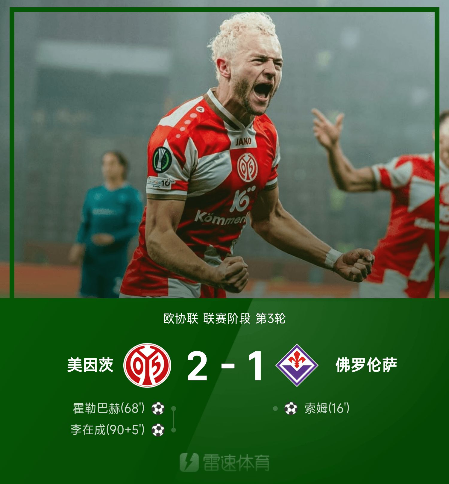 6686 Bản tin thể thao ngày 7/11 Ở vòng 3 UEFA Champions League 25/26, Mainz đã đánh bại Fiorentina với tỷ số 2-1. Phút 16 của hiệp một, Som ghi bàn giúp Fiorentina mở tỷ số. Trong nửa sau của trận đấu, Li Zaichen, người vào sân với tư cách cầu thủ dự bị, đã hỗ trợ Hollerbach ghi bàn gỡ hòa. Anh cũng đánh đầu ở phút bù giờ cuối cùng để hoàn tất cú sút cuối cùng, giúp Mainz đảo ngược chiến thắng.