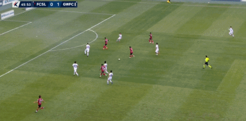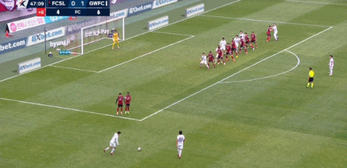 45+3' Gangwon thực hiện quả đá phạt trực tiếp trong khu vực ba giây, nhưng Li Sangxian không tạo ra được mối đe dọa nào