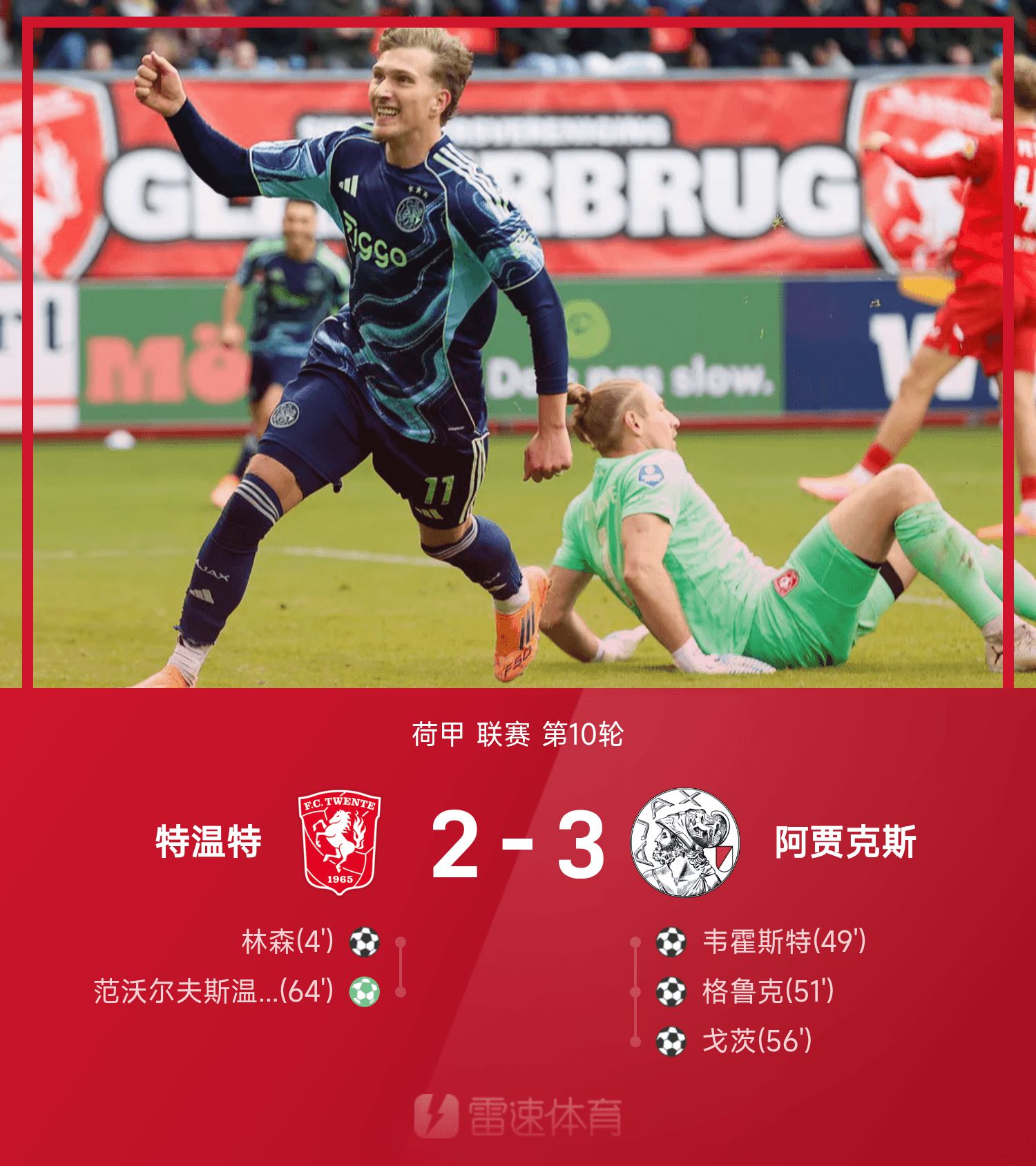 Tường thuật trận Eredivisie: Goetz chuyền và sút, Verhorst ghi bàn, Ajax ngược dòng Twente 3-2
